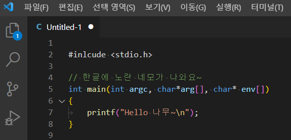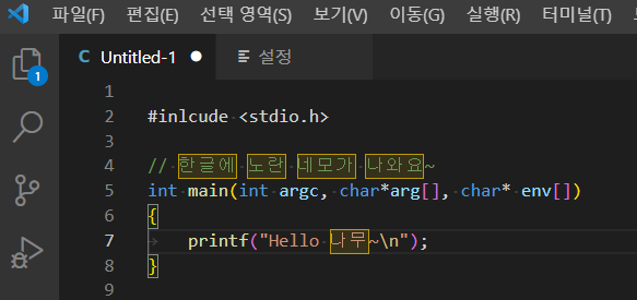 새파일 생성 시, 저장하지 않은 'Untitled-1' 과 같은 창에서 한글에 메모를 작성할 때 노란 네모가 나온다면